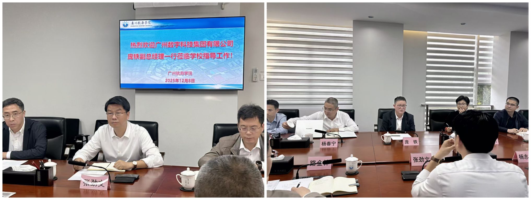 近日,广州数字科技集团有限公司党委委员、副总经理庞铁率队8人到访广州航海学院,围绕“车路云一体化”技术合作开展调研交流。学校党委委员、副校长张劲文主持座谈。