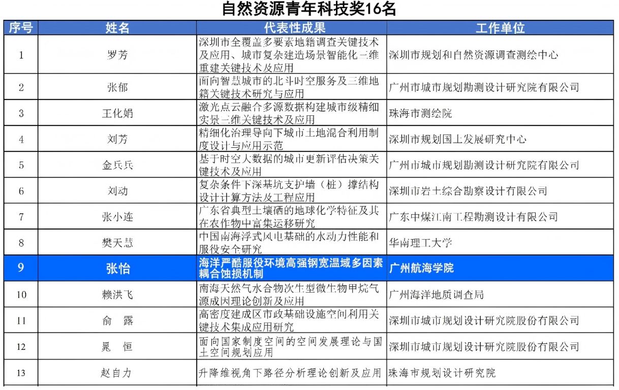 近期,金粤自然资源科学技术奖励办公室公布2025年度金粤自然资源科学技术奖获奖名单,广州航海学院张怡副教授申报的“海洋严酷服役环境高强钢宽温域多因素耦合蚀损机制”项目荣获自然资源青年科技奖。